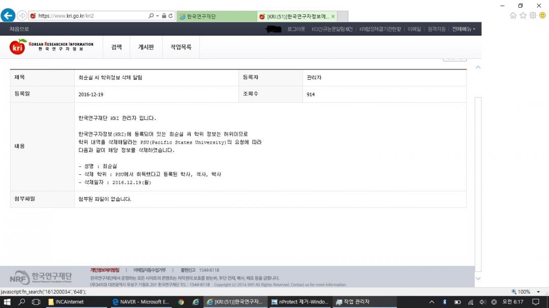 한국연구자정보(KRI)에 등록되어 있는 최순실 씨 학위 정보는 허위이므로