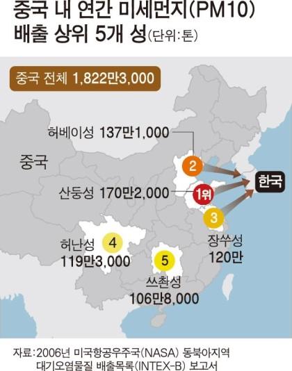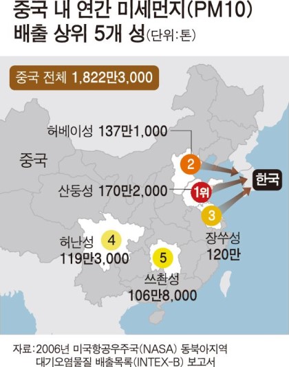 *중국 오염물질배출 상위 3곳(산둥ㆍ허베이ㆍ장쑤) 동북지역 몰려 있어 북서풍 타고 사계절 한반도 영향