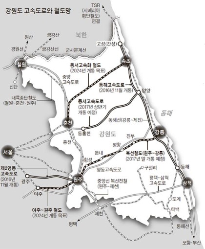 5. ‘평창 동계 올림픽’ 앞두고 서울- 강원도 거리 짧아진다 → 제2 영동고속도로 개통 서울-원주 50분대. 동서고속도로 공정률 93%, 올 연말 준공. 열차로 인천공항- 강릉 1시간 52분...(중앙)▼