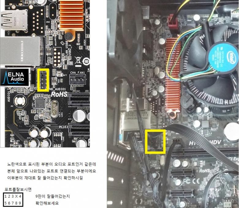 사진상으로는 전면 오디오가 연결되지 않은걸로 보입니다. 오디오 단자는 좌측 elna audio라고 써진부분 바로 오른쪽에 있습니다.