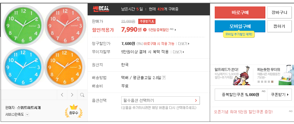 [인터파크] 스위트하트 무소음 스무디 벽시계 (7,990원/무료) > 자유게시판