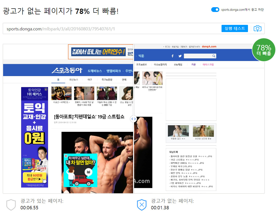 광고 유무에 따라 로딩 시간이 어떻게 되는지 비교도 해줍니다.