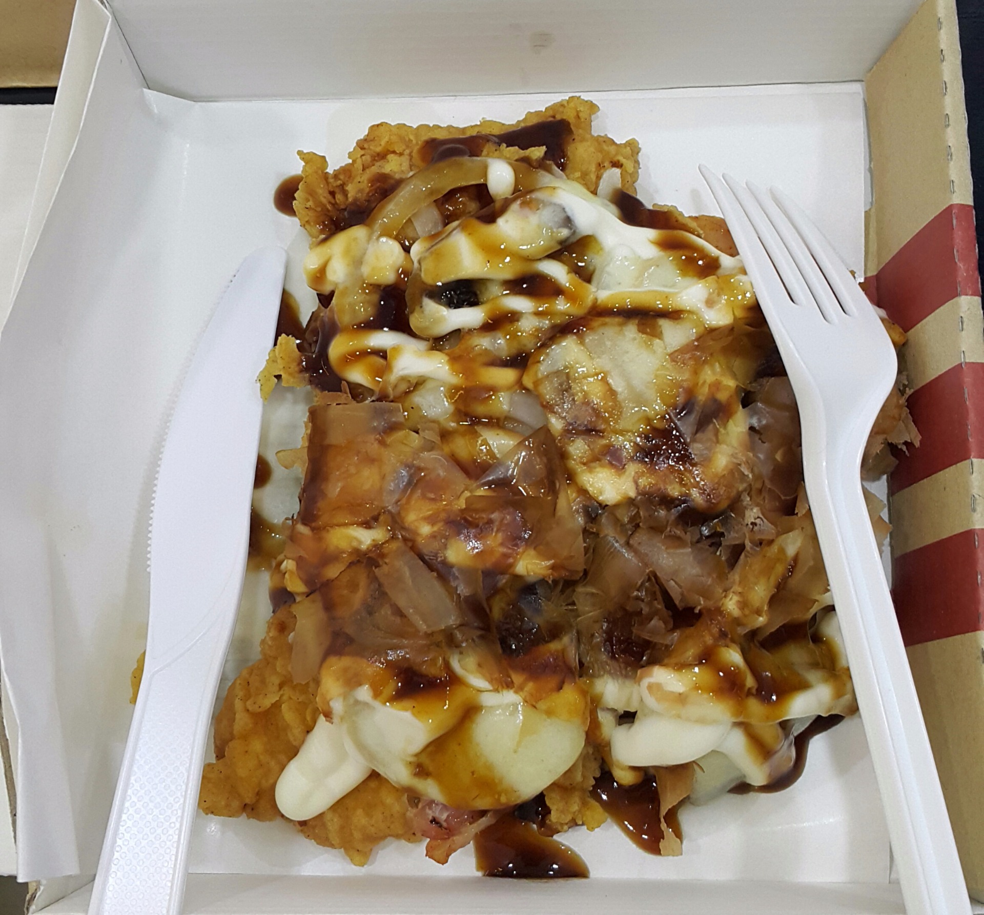 치즈, 베이컨, 양송이 버섯, 양파, 가쓰오부시, 오코노미야키 소스, 마요네즈가 올려져 있습니다.