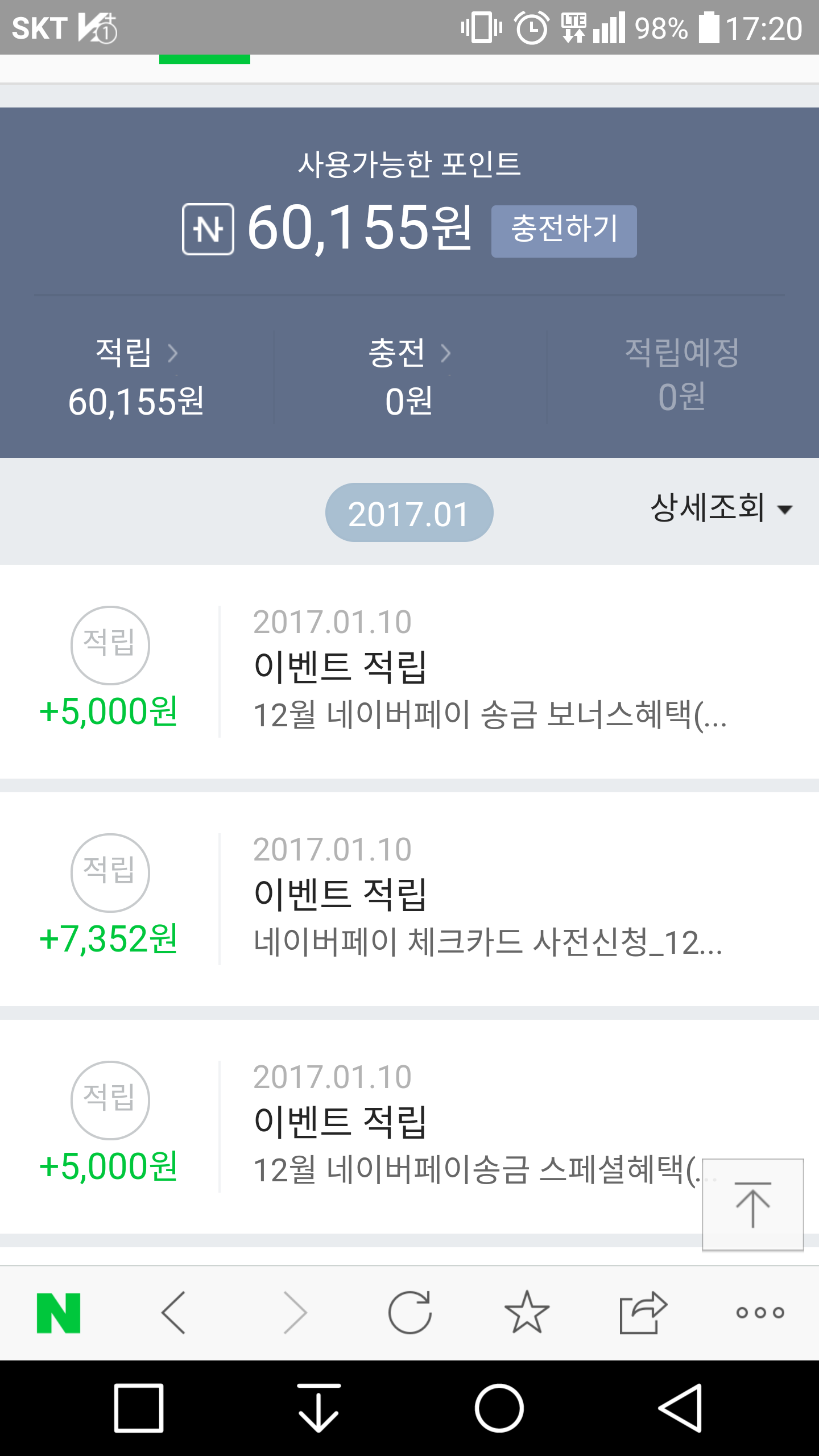 이렇게 들어오면 맞는건가요? 이벤트 내용이 뭐였는지 가물가물하네요.. 체크카드 써도 뭐 준다고 했던거 같은데.. 사진에 보이는건 네이버 체크카드 사용시 1% 추가 적립해주는 이벤트로 들어온거예요.