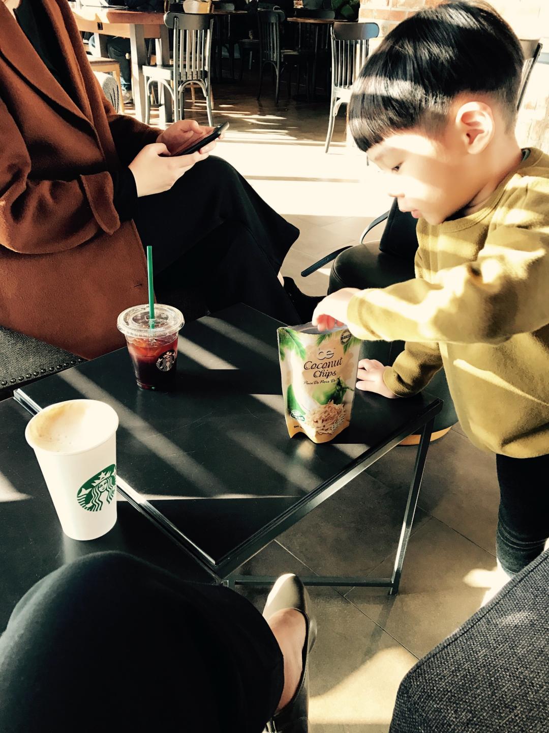 결혼식 축하 잘 해주고 여동생 데리고 집앞 스벅에서 쿠폰쓰고 있어요~ 아이는 과자로 잠시 달래주고 ㅎ