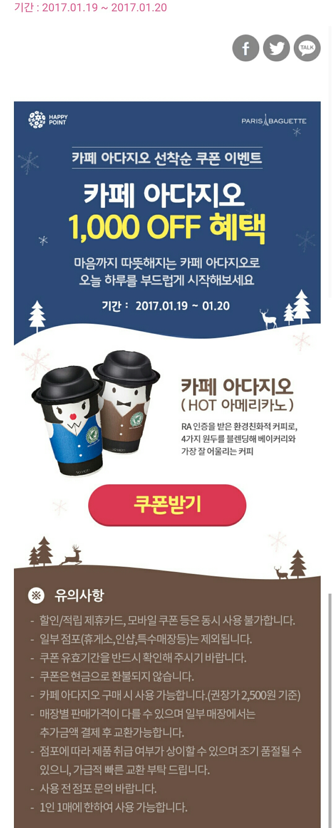해피앱 파리바게트 카페아다지오 1,000원 할인 쿠폰