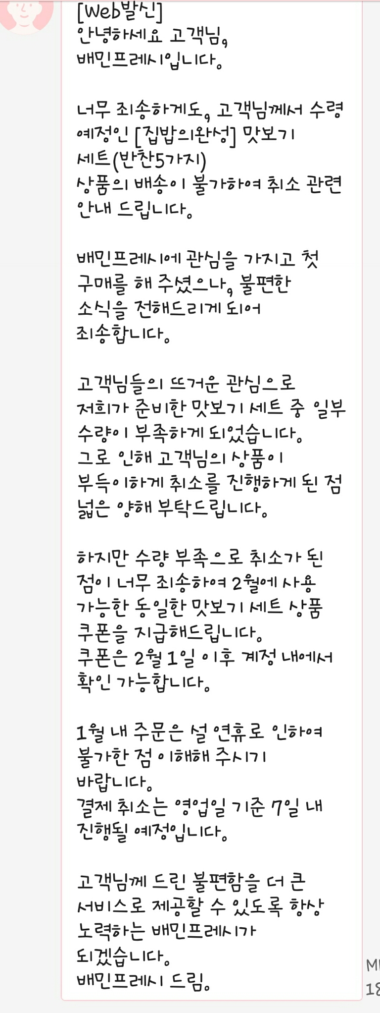 반찬만시켰는데도 취소문자왔어요ㅜㅜ |