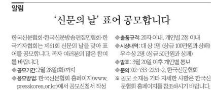 ​10. '신문의 날' 표어 공모' → 한국신문협회 홈페이지(www.presskorea.or.kr). 2월 28일 마감. 4월 7일은 61주년 신문의 날. 1896년 이날은 독립신문 창간일.(중앙 외)▼