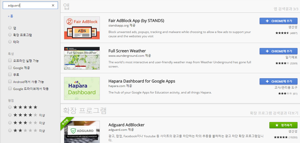 여기서 좌측 상단 텍스트박스에 adguard를 타이핑하시고 엔터치시면 이렇게 확장프로그램이 나옵니다