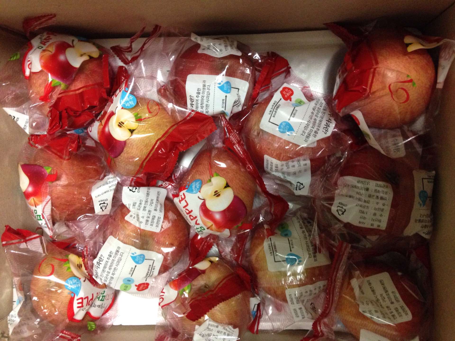 어이쿠... ㄷㄷㄷㄷㄷ 박스 안에 든 사과 개별포장이 다 찢어진건가요? |