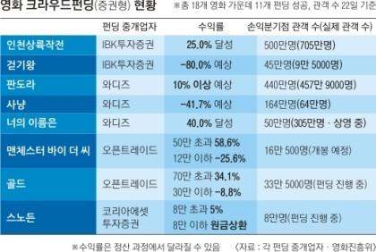 ​5. 일반인들의 영화투자 ‘크라우딩 펀딩’ → 지난해 1월 처음 도입 이후 18개 영화에 도입. ‘인천상륙작전’ 25% 수익, 상영중인 ‘너의 이름으로’는 이미 40% 달성... ‘걷기왕’은 -80%.(서울)▼