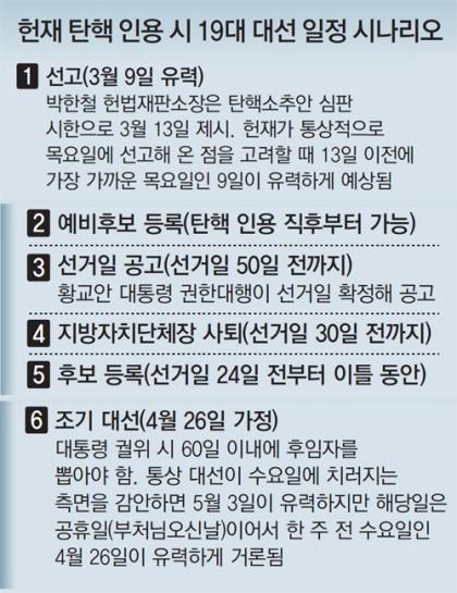 ​7. 대선, 4월 26일? 이유 → 박한철 헌재소장, 3월 13일 이전 결정 밝힘. 60일 이내 대선. 대선은 통상 수요일, 5월 3일 유력... 이날은 부처님 오신날. 공휴일 피한 일주일 전 수요일은 4월 26일.(동아 외)▼대선 일정 시나리오