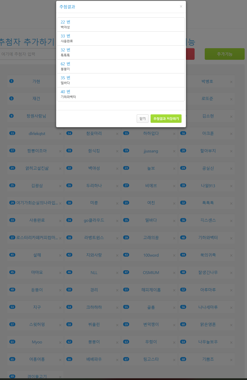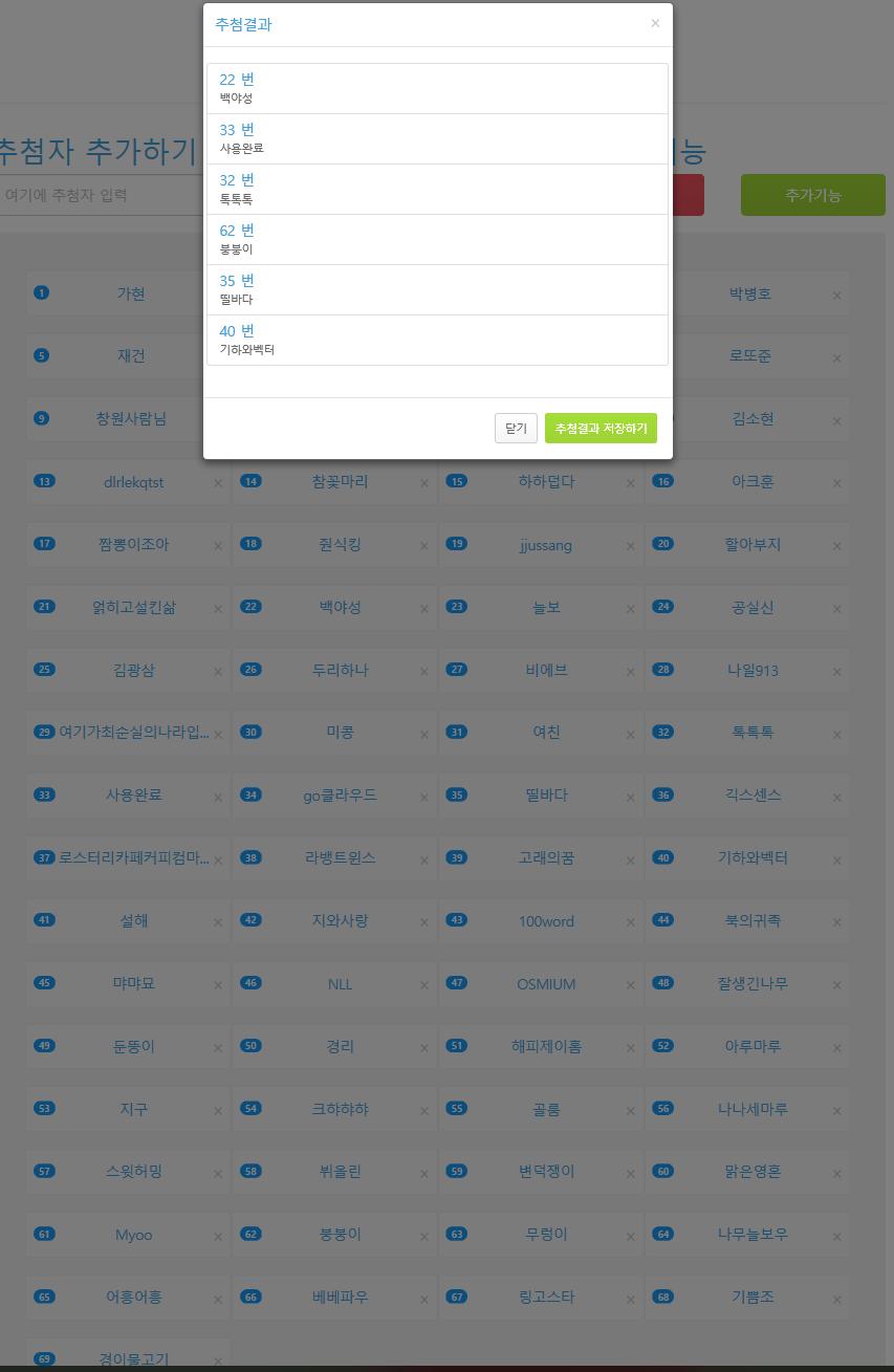 리플 보면서 한분씩 닉넴 입력했는데 눈이 좋지 않아 이름에 오타가 있을가능성도 있으니 양해 바라구요.