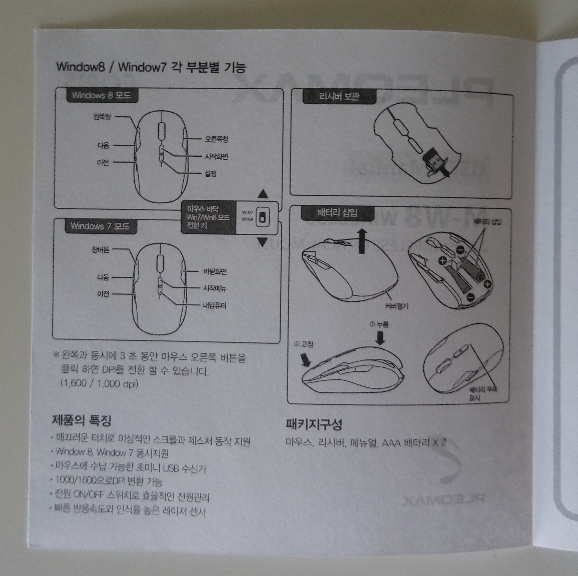 1. 바닥에 있는 윈도우7/8 전환 스위치에 따라 버튼 기능이 달라짐
