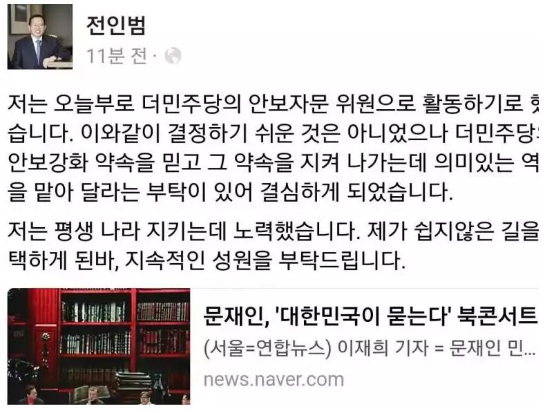 전인범 전 장군이 더민주에 영입되어 안보자문위원으로 활동한다는 기사 보다보니