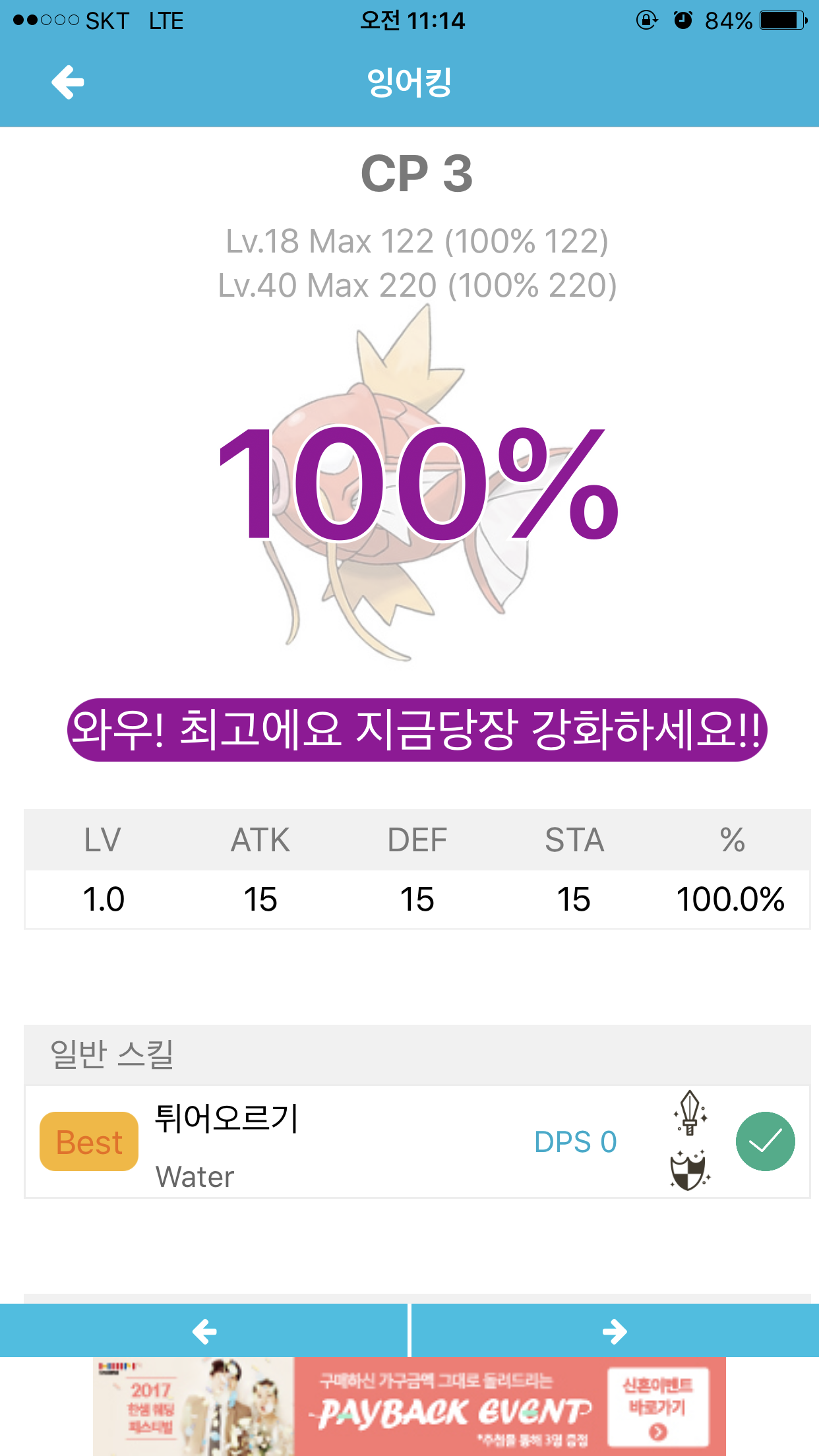 cp가 ㄷㄷㄷㄷ 잉어킹 안그래두 사탕 400개라....ㅠㅠ 일단 키우고싶으시면 진화후에 스킬 택한느거 보고 별로면 버리시는게 맞아요.. | ||