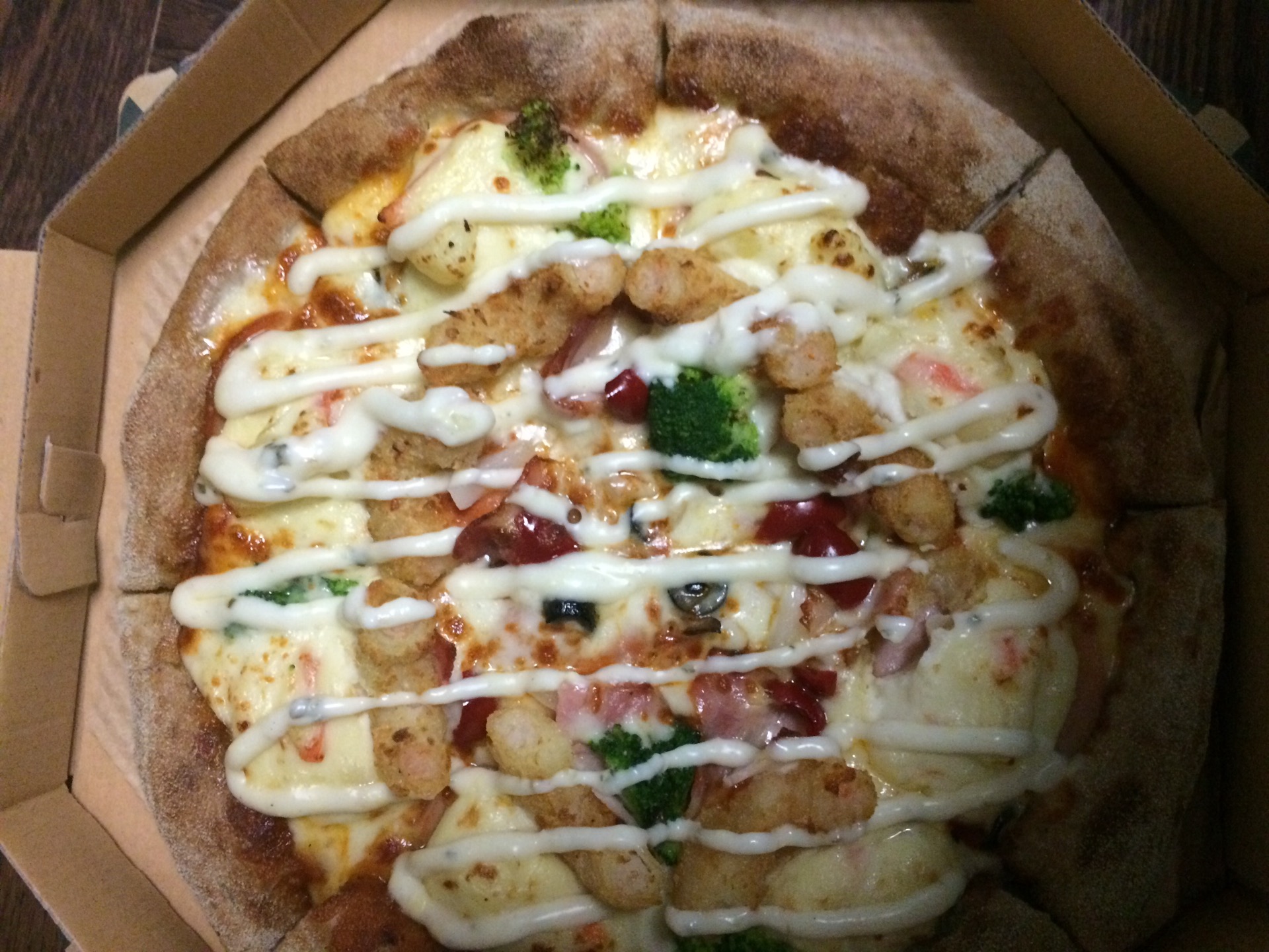 맛은 음.. 묘하네요 새우링 감자마요 치즈 등등이 섞였는데 전 클래식한 피자를 좋아해서그런지 엄청 맛있다는 아니였습니다 하지만 재료를 듬뿍 넣어서 맛있긴해요 아 물론 할인이 왕창 된거 감안하면 좋습니다 피자스쿨 포테 치즈크러스크도 9000원 이러니까요
