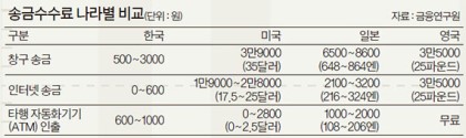 3. 은행 송금수수료, 나라별 차이 커 → 韓 300~3000원, 美 3만9000원, 日 6500~8900원, 英 3만5000원. 인터넷 송금도 우리보다 10배 이상 비싸.<금융연구원>.(중앙)▼