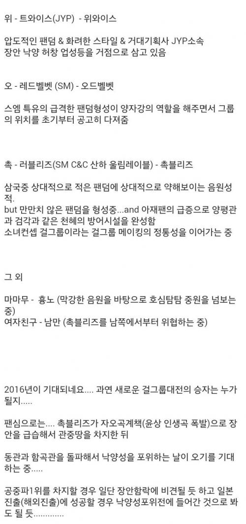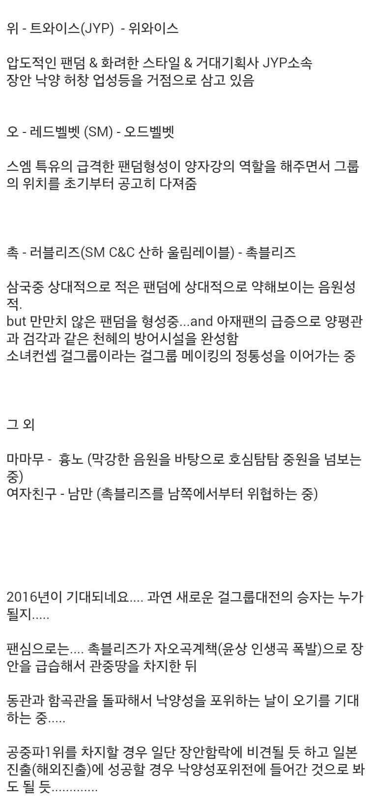 트와이스 말고는 다 고만고만한, 내일모레를 장담하기 어려운 상황이라고 봅니다.