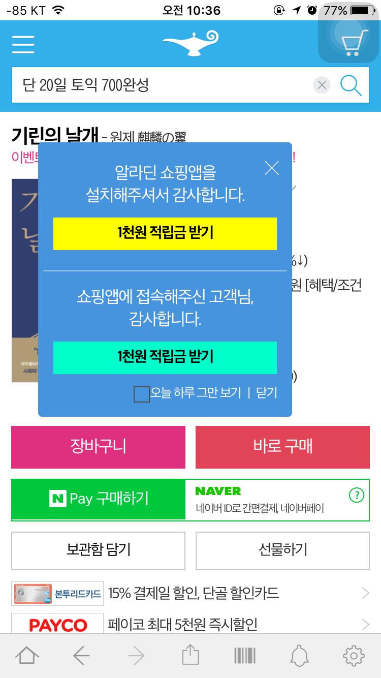 저는 베스트에올려주신거에서 선착순에늦어서 4000원밖에못받고 그냥 날리나했는데 앱설치해서 추가로더받았습니다~ http://www.aladin.co.kr/m/mevent.aspx?EventId=138792