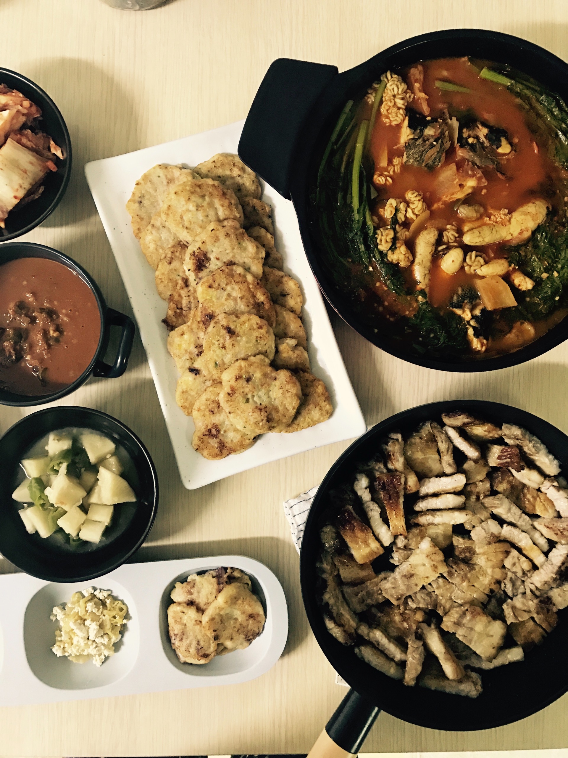 우럭에 알 듬뿍 넣은 우럭탕 과 오징어+새우 다지고 야채도 넣어 부쳐내고 삼겹살 구워 고추+마늘+양파와 갈치속젓 끓여내서 찍어먹으려구요.