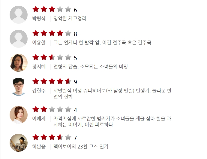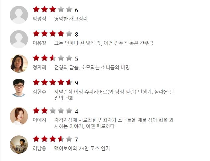 아무래도 소재가 여성을 납치하고 뭐 학대하는거 때문에 여성평론가들이 개인적의견이 많이 들어간 느낌을 지울 수가없네요..ㅎ |
