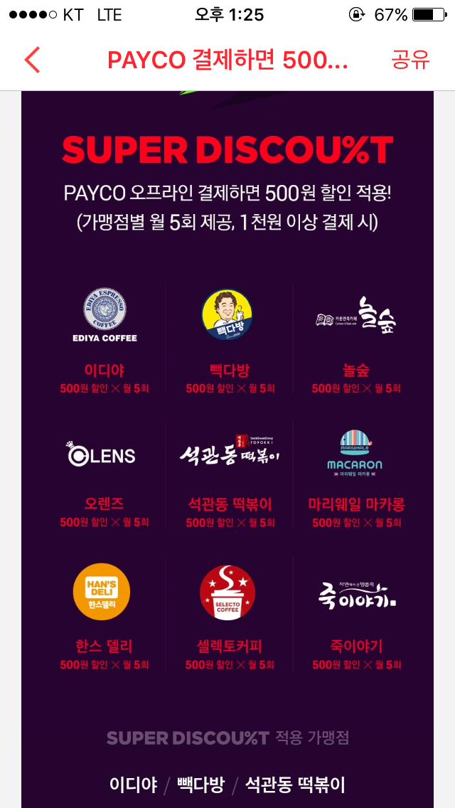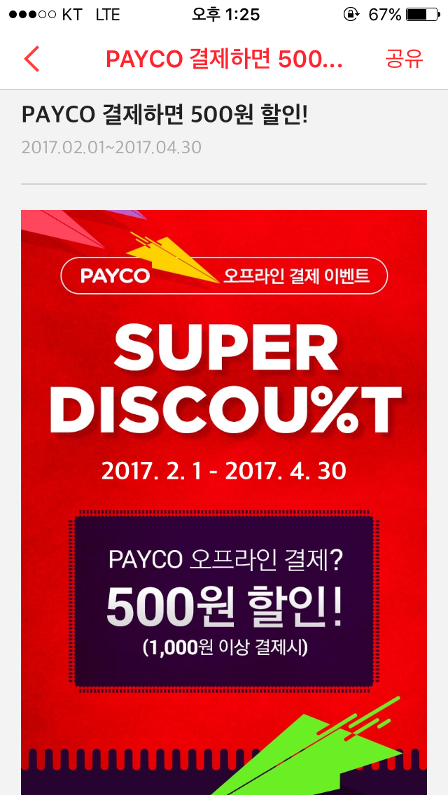 사진에 나온 가맹점에서 천원 이상 페이코로 결제하면 500원 할인해줍니다!