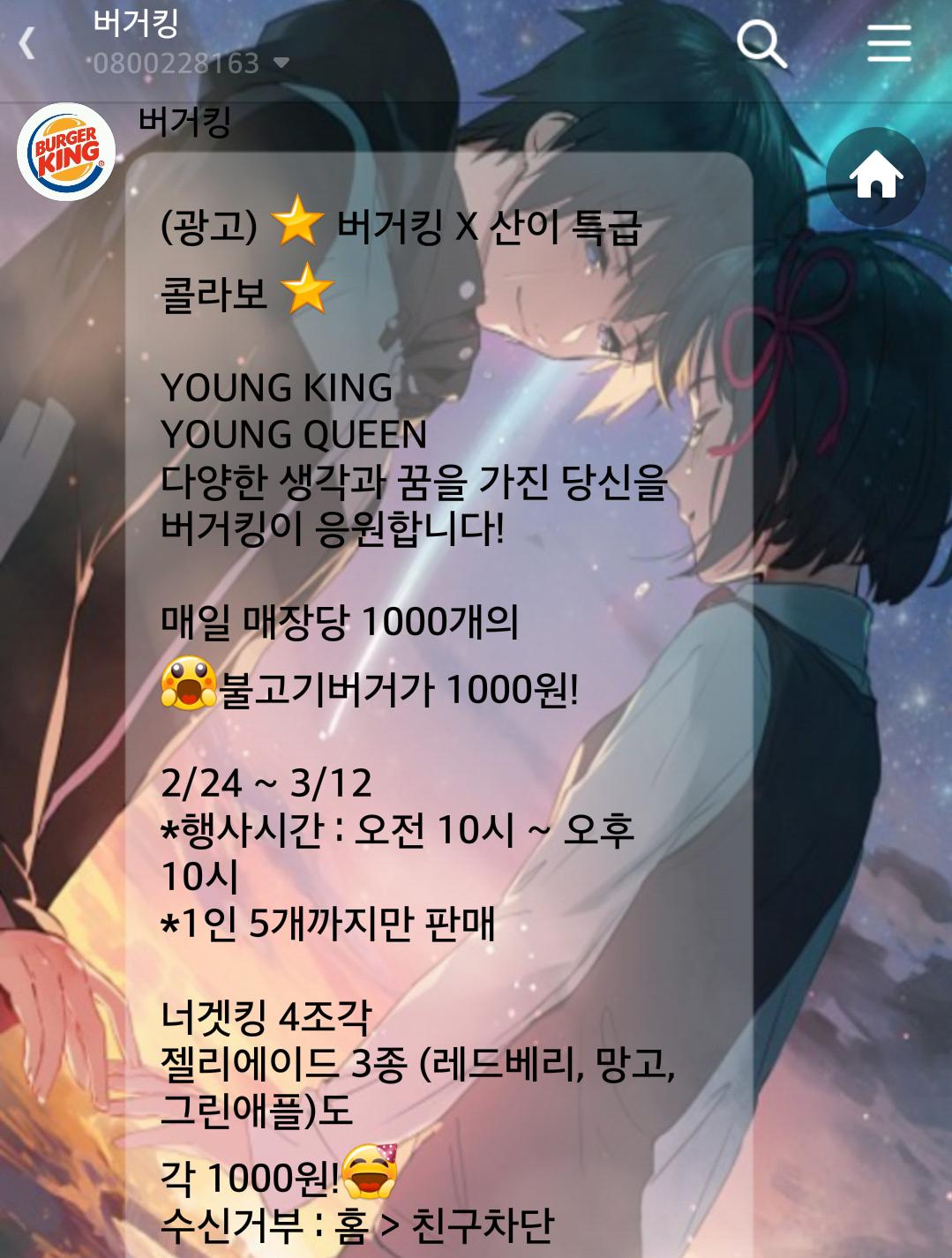 카톡으로 버거킹소식지가왔는데 오늘부터 3월12일까지 매일 1000개의 불고기 버거가 1000원이네요 후훗