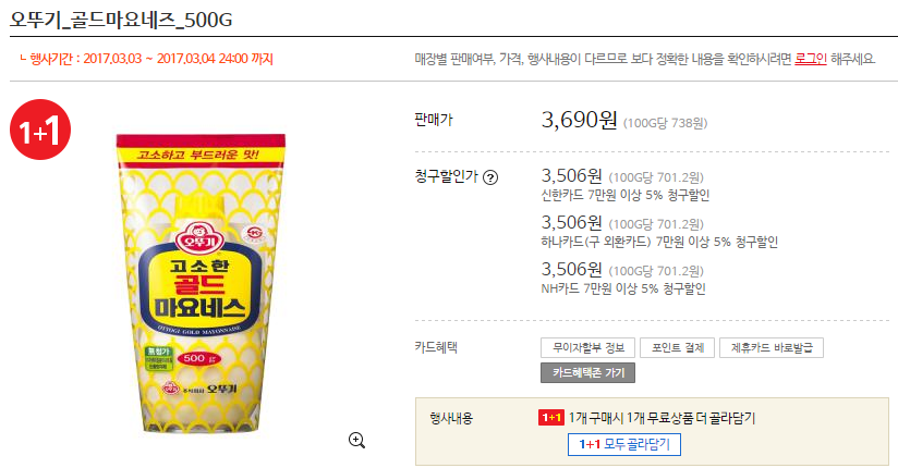 오뚜기 500g 1+1 사왔습니다. 매대에 있는 종이 쿠폰도 적용가능합니다. (개당 300원)