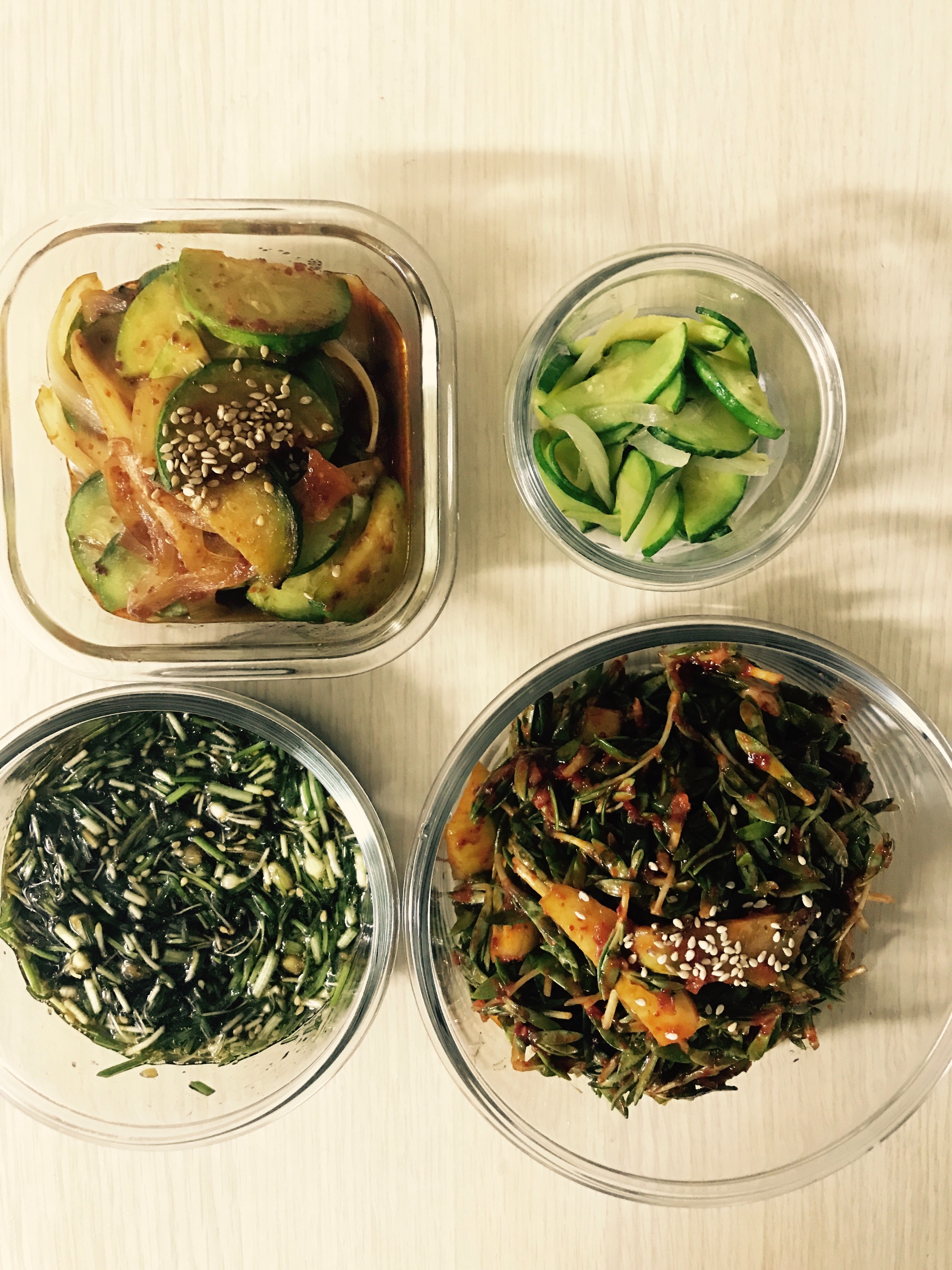 달래양념장과 돌나물오이무침, 아이용 호박볶음과 매운호박볶음. 가스렌지에선 된장찌개가 끓고있고 달래가 대기중이구요.
