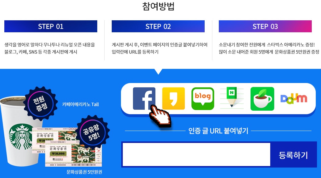 - SNS공유 후, URL인증까지 완료해야 참여가 인정(모든 SNS 가능)되며, 내용은 전체공개로 되어 있어야 합니다.