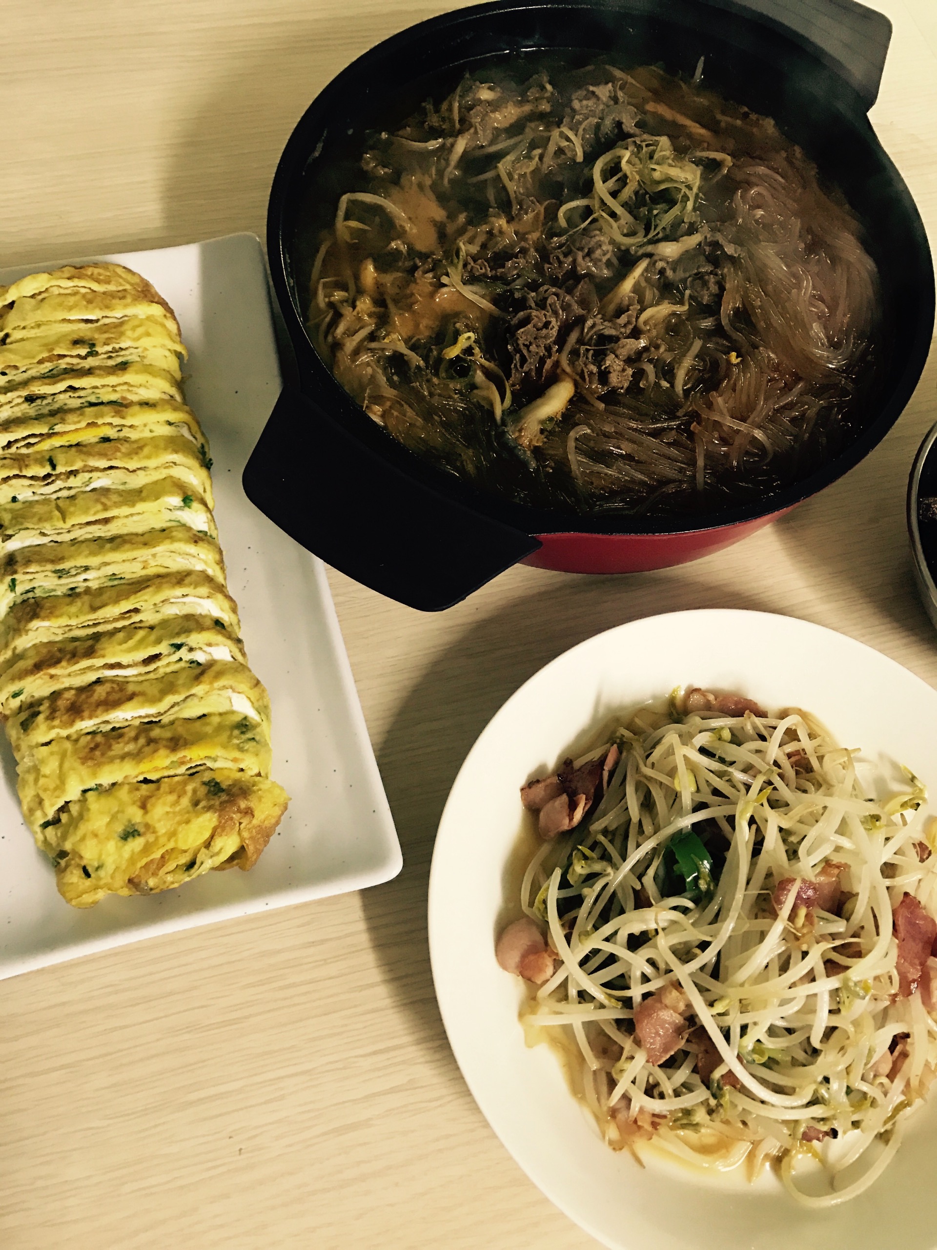 베이컨숙주볶음 - 청양고추 넣어 매콤하게 볶아내고 둘다 매우니 달걀말이 넉넉하게 부쳐봅니다: