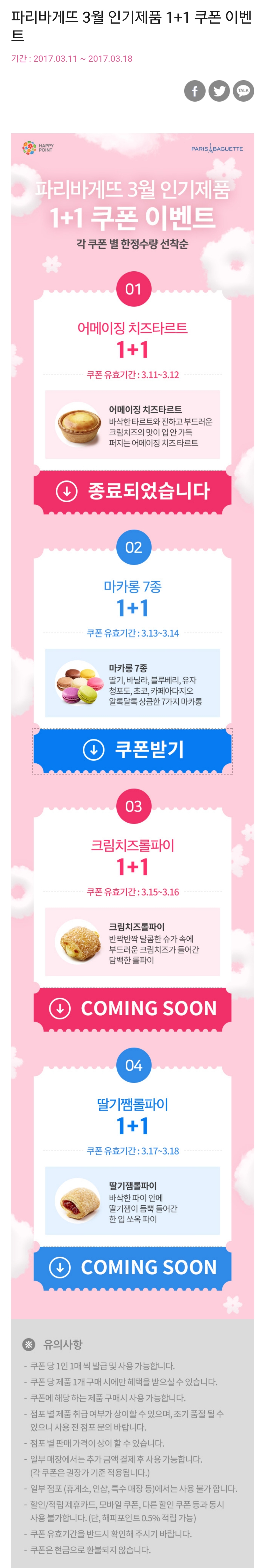 해피앱 고객 특별 혜택! 파리바게뜨 3월 인기제품 1 1 쿠폰 이벤트 http://apiaws.happypointcard.com/event/eventView.spc?eventseq=1709