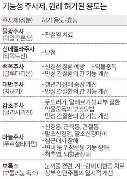 7. 백옥주사, 신데렐라주사, 마늘 주사... → 미백, 피로해소 효과 검증 안돼. 원래 백옥주사는 만성간질환, 신데렐라 주사는 난청, 마늘주사는 신경통 치료용. 15일 의사협 토론회.(중앙)▼