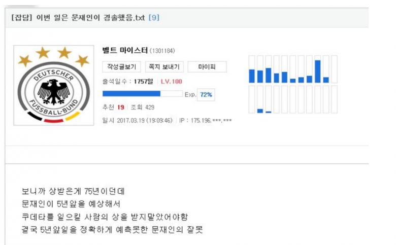 루리웹 어떤 분이 일침 날리던데요. 전두환이 80년에 쿠데타를 일으킬걸 예지 못해서 75년에 훈장 받은 문재인이 잘못한거라고. 나이가 몇살이든, 군대에 억지로 갔든 자기 본분에 충실해서 받은 상이 자랑스럽다고 하는게 왜 문제라고 하는것인지, 또 그걸 폄훼하는게 이해가 안가네요.