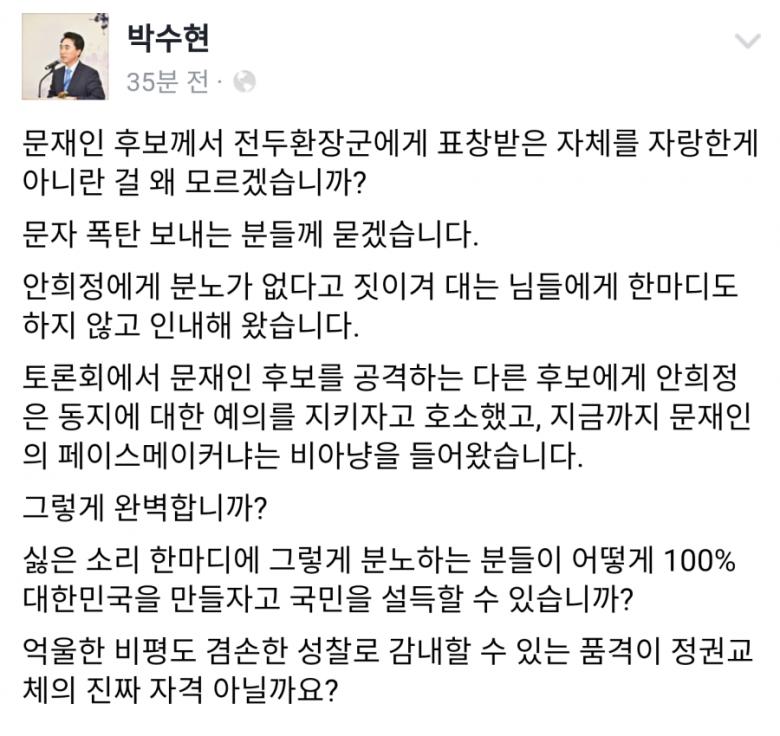 광주 토박이인데다가 문재인 예비후보를 지지하지 않는 사람이 말씀드리면...종북이라 대놓고 말도 안되는 지적질하는 사람들 들으라고, 그리고 대한민국 수많은 군필자들에게 한표 어필하려는 시도에 왠 갑자기 광주 민심 운운하는지 깜짝 놀랐습니다. 솔직히 인터넷이나 언론에서 어떤 지시 또는 프레임 만들기가 아니었다면 과연 어제 그 사진(사진은 수년 전에 이미 공개된 사진아니었던가요? 갑자기 안희정 예비후보측과 이재명 예비후보측, 그리고 국민의당이 득달같이 달려드는 순간이 확 증폭되는 느낌마져 들더군요.) 이후 이렇게 온라인이 뜨거워지는건 무슨 이유일까요? 문재인 후보의 뜬금없는, 타이밍 애매한, 너무 두리뭉실한 발언들은 지난 대선 때 박근혜와의 토론에서도 이미 지적받은 사항이라고 생각합니다.
