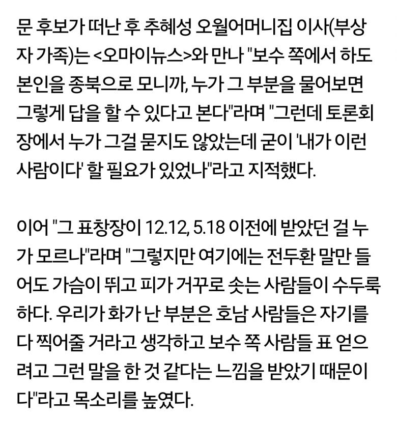 지금 비판받는 이유는 굳이 하지않아도 될 말을 해서 비판받는 걸로 보이거든요? 물론 문전대표님 지지자들 입장에선 이해 안되실 수도 있겠지만 저도 호남사람이고 그런 아픈기억은 없지만 굳이 그사람을 그것도 가장 자랑스러운순간을 이야기할때 꺼냈어야 하냐는 거에 대한 비판입니다. 특히 호남경선을 앞두고 거의 매주 민심을 살핀다며 찾아가는 이 상황에서 말이죠