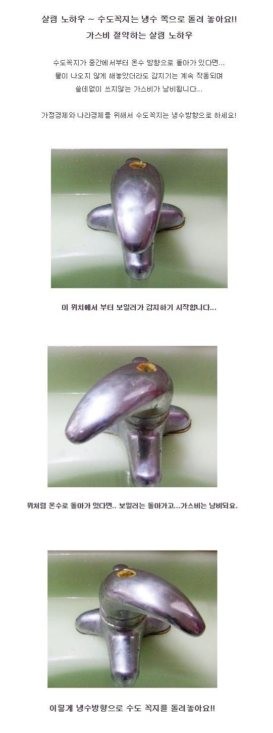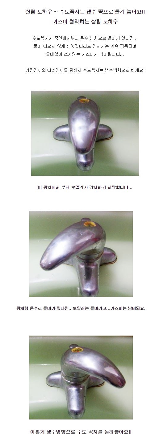 찬물로 수도꼭지를 돌려놓아야 가스비가 절약된다는 말은, 원래는 온수로 꼭지가 돌아가 있으면 찬물만 사용하려고 꼭지를 열어도 온수가 최소한 섞여서라도 나오고, 그 때문에 보일러가 돌아가기 때문에 조심하라는 의미에서 설명한 것이었겠죠.