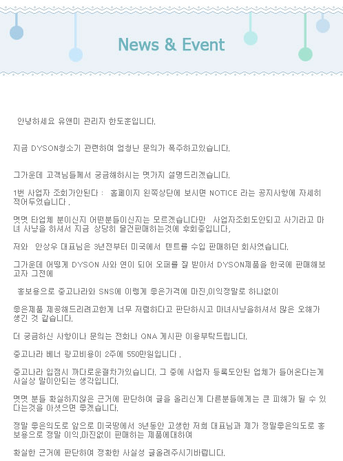 다이슨에 MR. Anh 이라는 사람과 Sales agreement 가 되어있는지 문의 메일 보내보면 제일 확인이 빠를거 같은데욥. '오퍼를 잘받아서' 이 말이 제일 웃겨요. 어차피 국내에 공식 딜러가 판매 잘하고 있는 마당에 딜러끼리 머리채 잡고 싸우게 일개 수입업자 한테 오퍼를 잘 준다?... 다이슨에서 알면 뭐라고할지 궁금하네요. |