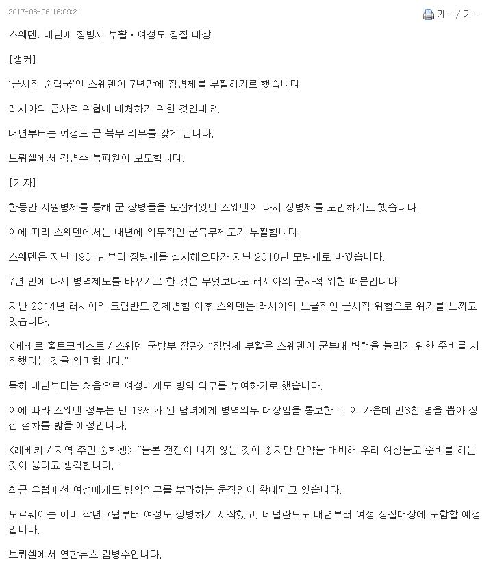 러시아의 크림반도 병합에 위협을 느껴 징집제가 부활하고 남녀 구별없이 징집대상이라는 스웨덴...
