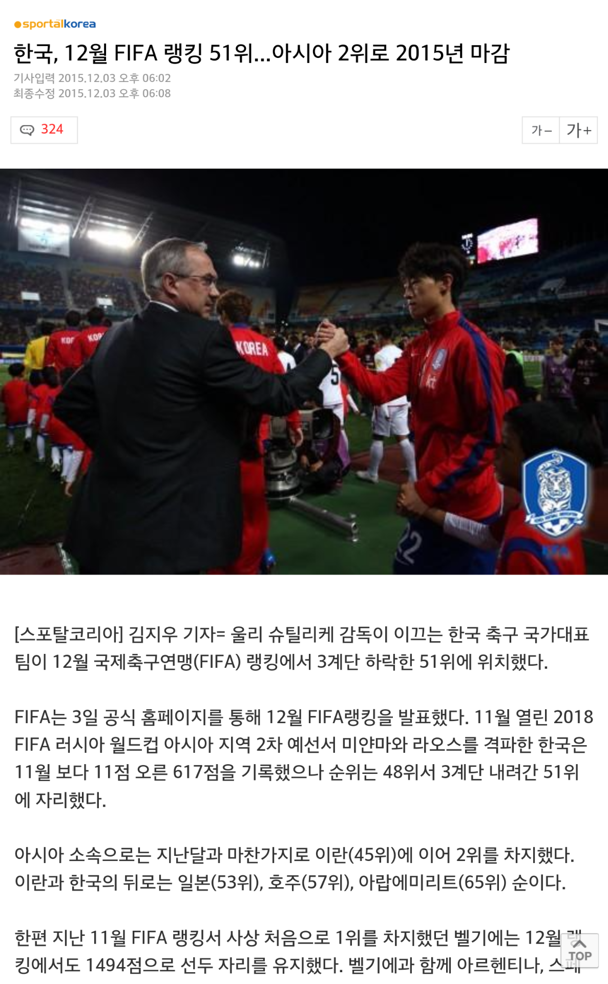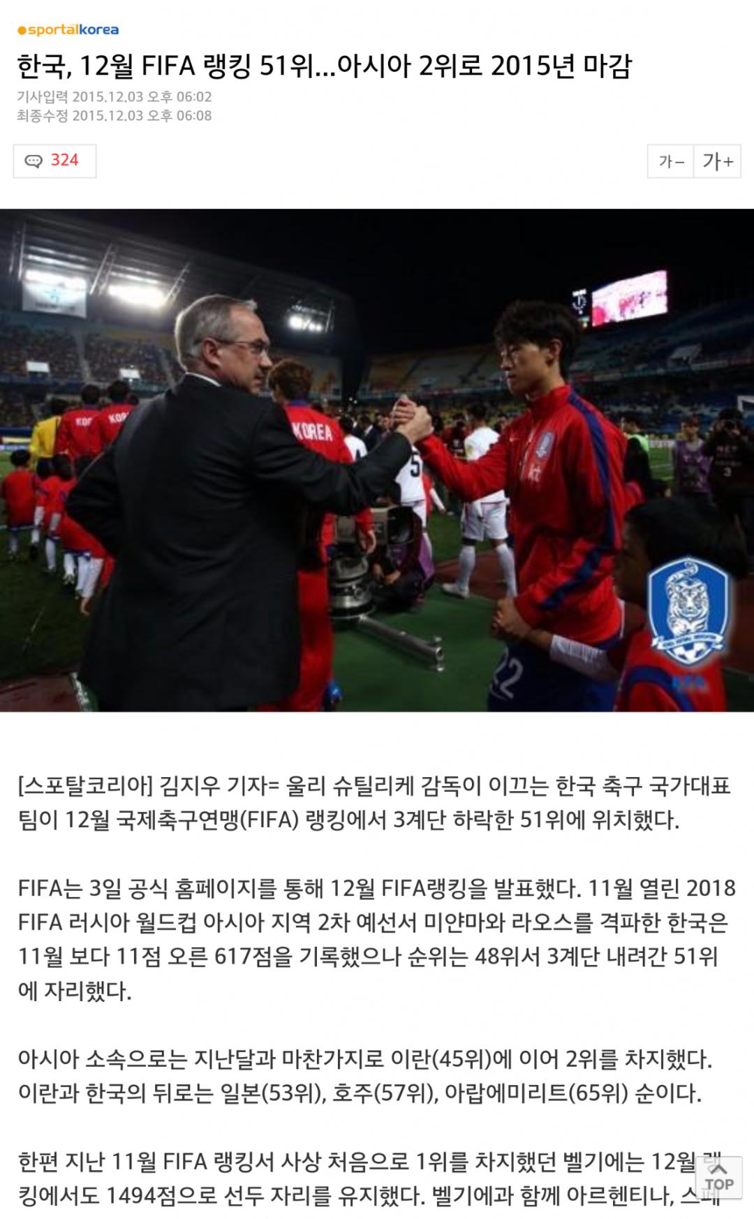 아시아 소속으로는 지난달과 마찬가지로 이란(45위)에 이어 2위를 차지했다. 이란과 한국의 뒤로는 일본(53위), 호주(57위), 아랍에미리트(65위) 순이다.