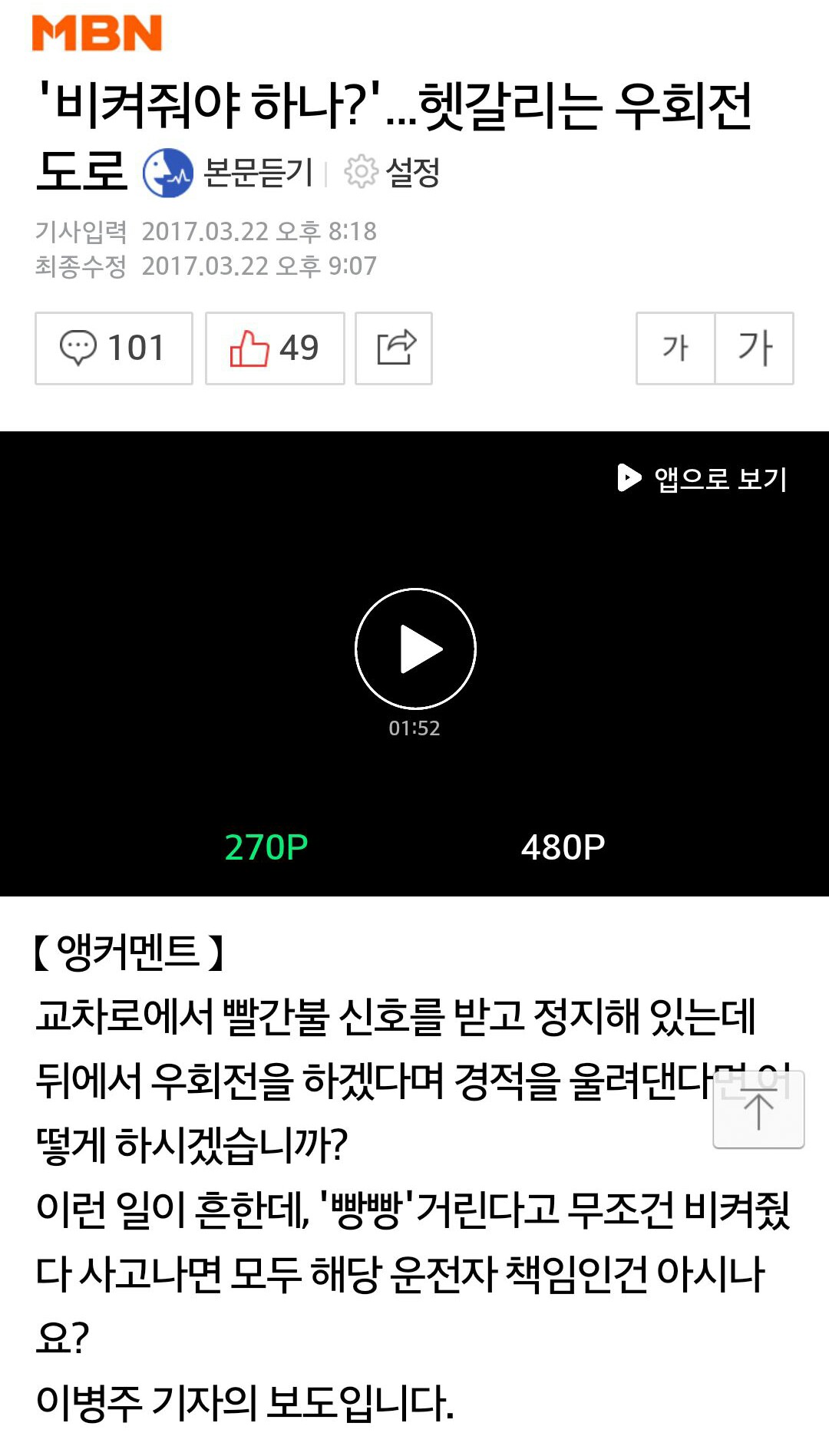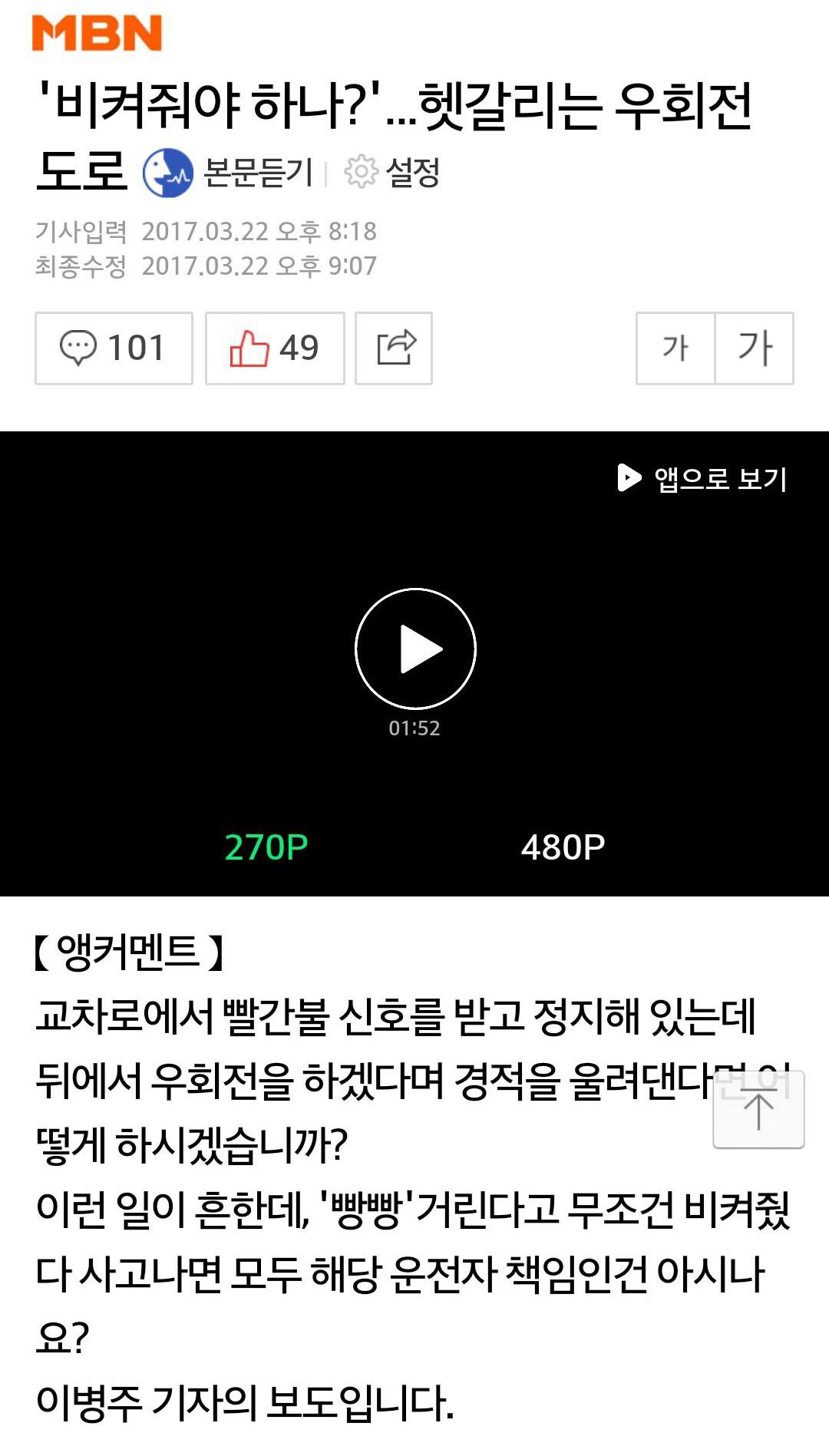 가끔씩 우회전 하는 차 길 비켜주다가 범칙금 문 글이 종종 보면 비켜주기가 망설여지더라구요... |