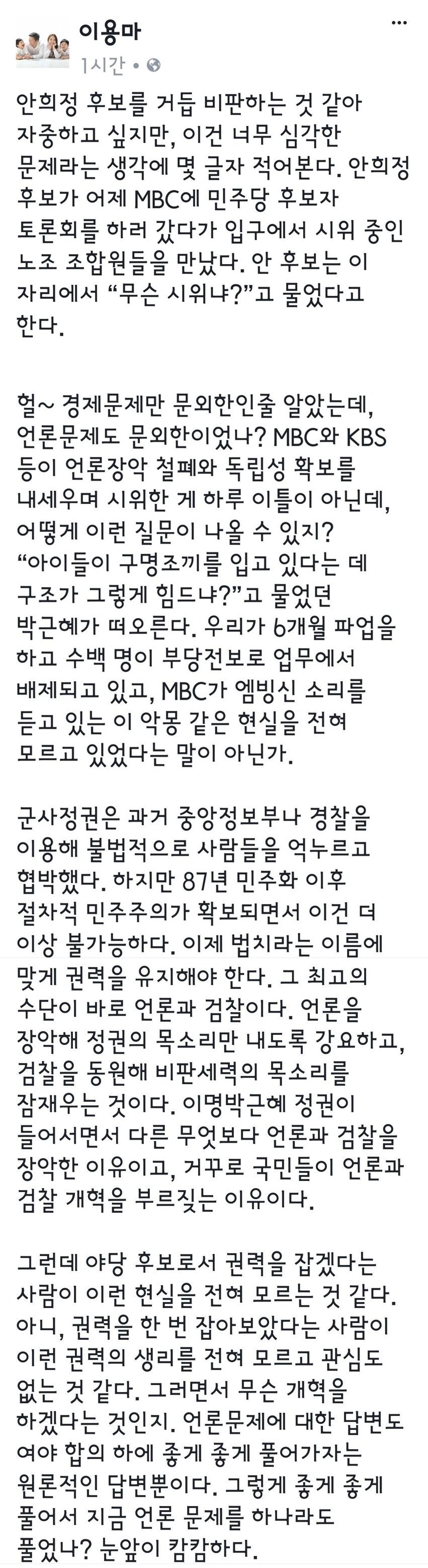 MBC 노조 파업을 이끌다 해고당한 이용마 기자가 페북에 쓴 글인데...