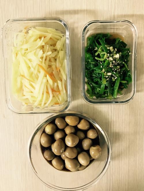 오늘의 반찬은 미나리무침과 감자볶음, 간장게장 먹고 남은 간장에 조린 메추리알장조림 이예요.