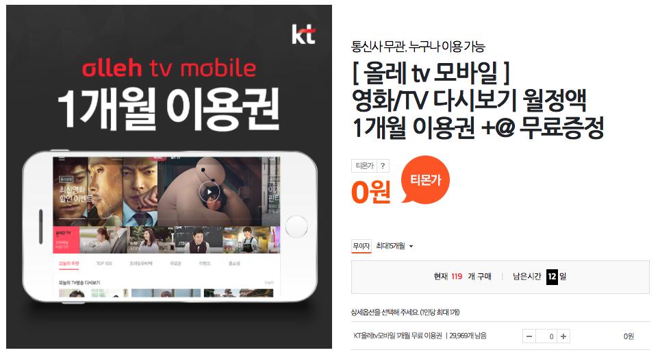 티몬에서 올레tv모바일 1개월 이용권 무료딜이 있네요