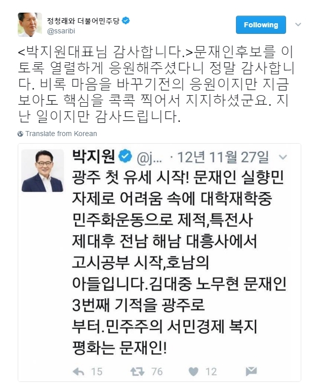 [펌] 정청래 트윗 '박지원 대표님 감사합니다.'