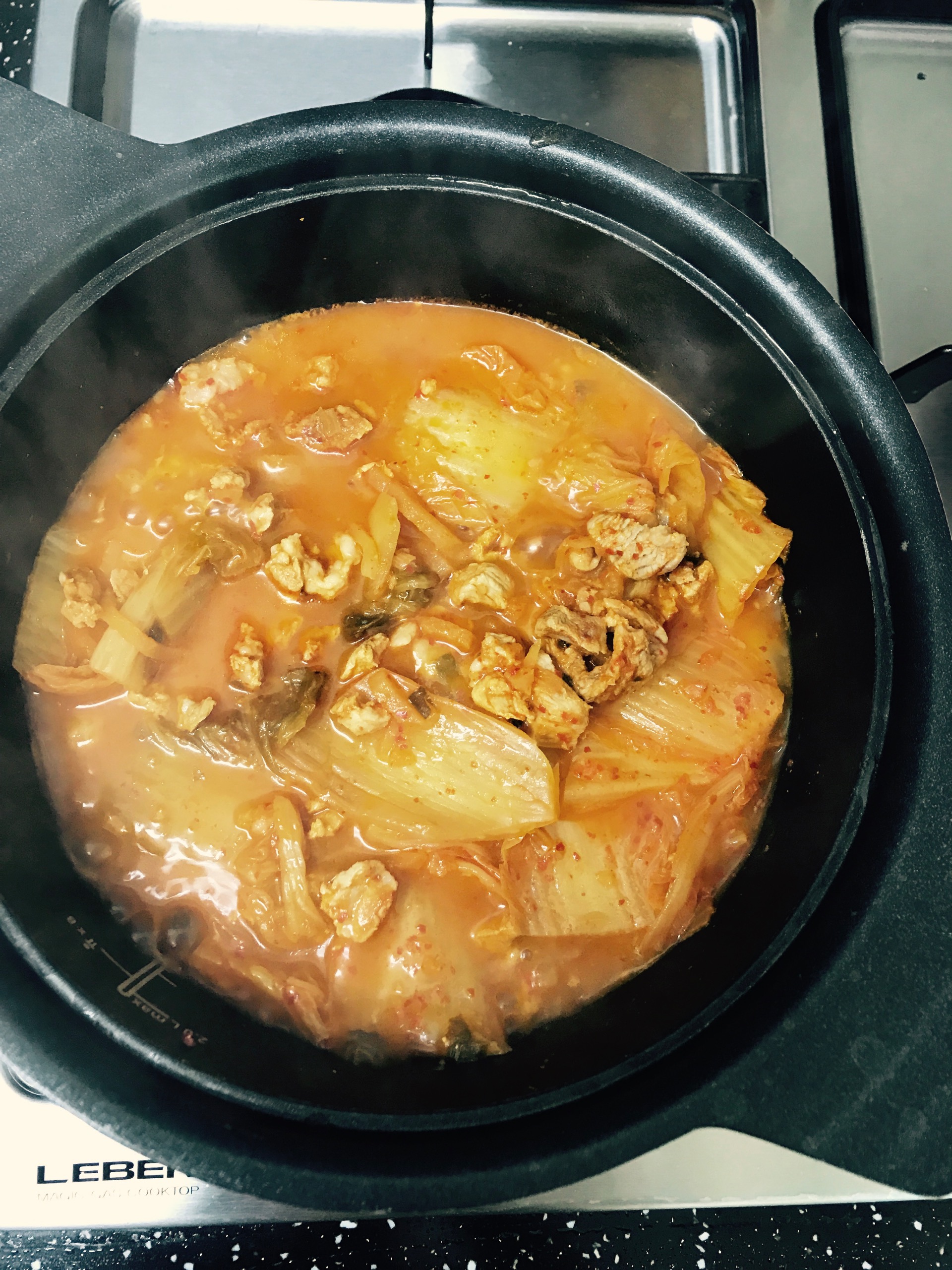 불 끌때쯤엔 묵은지로 끓인것 같은 비쥬얼의 김치찌개 완성입니다 ㅎ