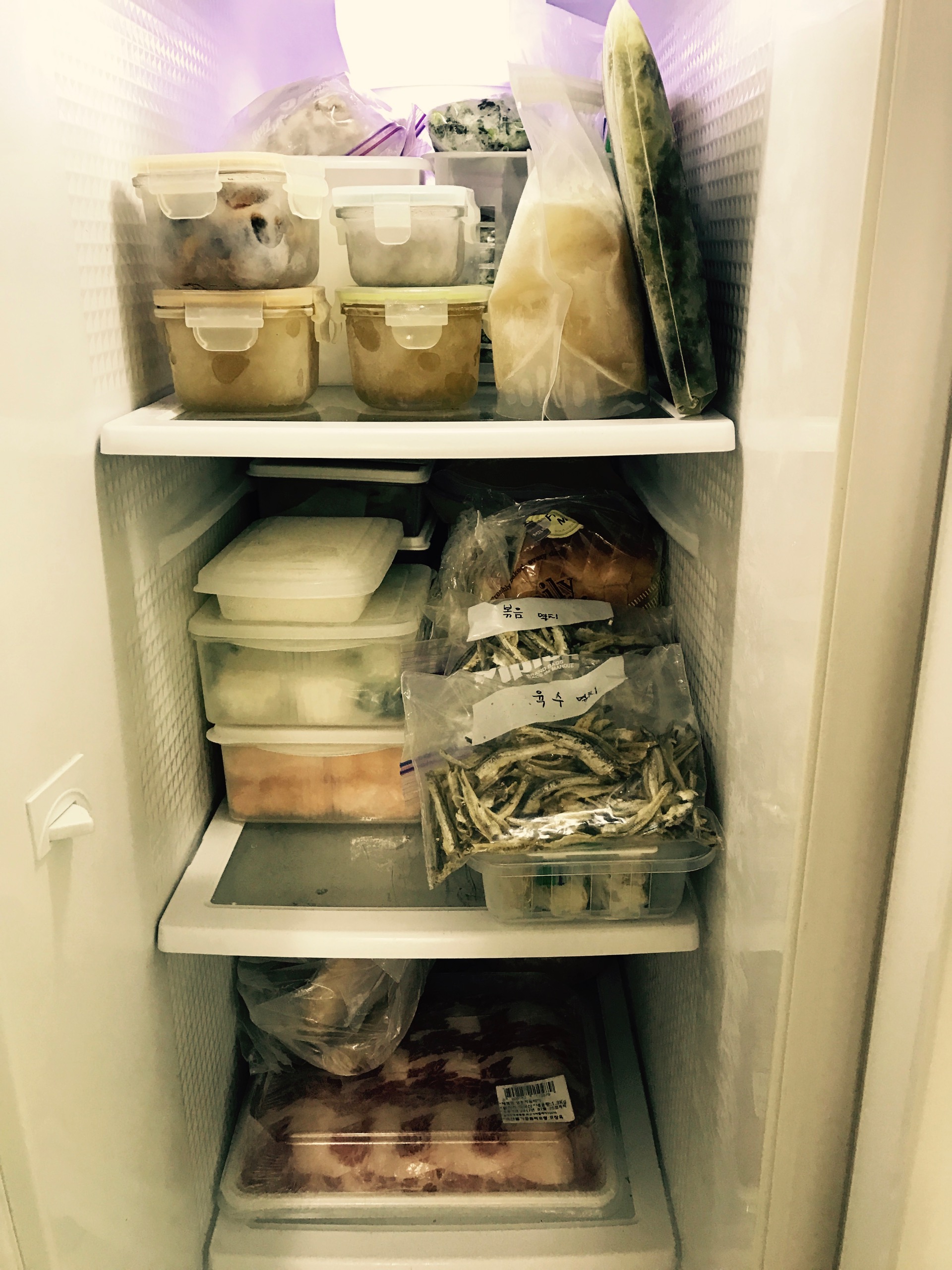 냉동실에 건어물도 많아서 한칸의 반은 건어물 용기로 차있고, 반은 떡돌이 아들이 좋아하는 떡이 반절 자리 차지하고 있고.