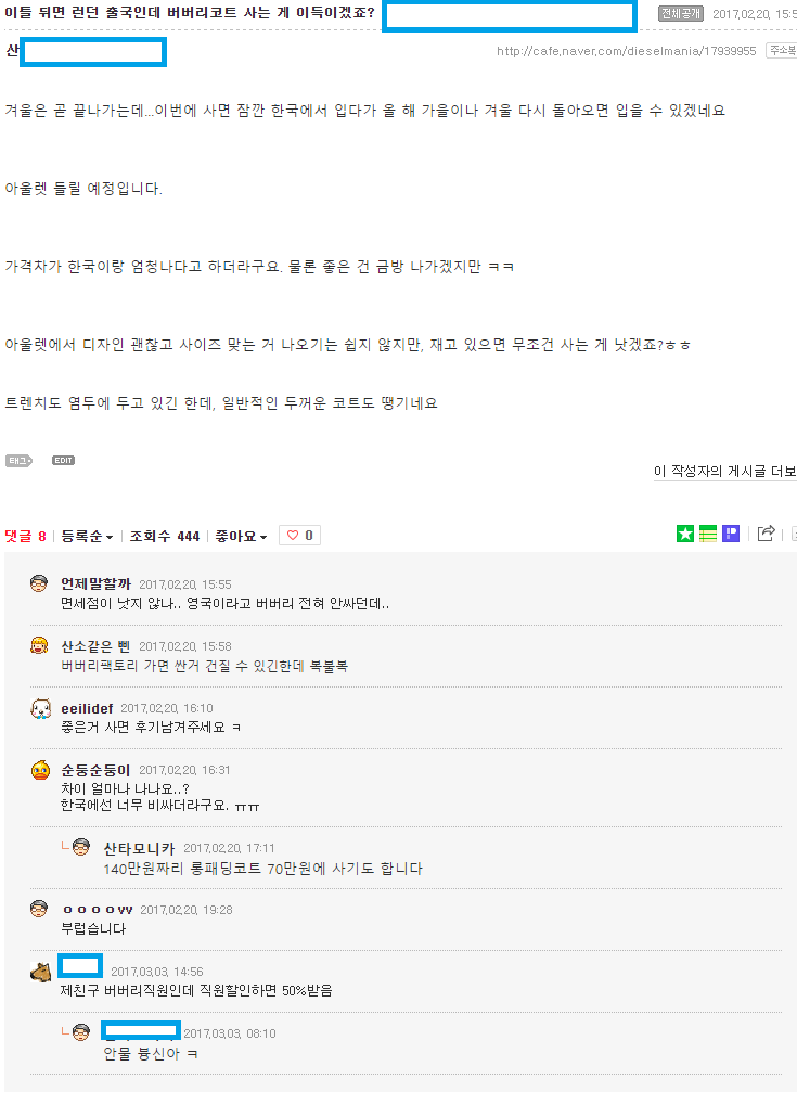 " 제 친구 버버리직원인데 직원할인하면 50% 받음 수고~ㅋ"
