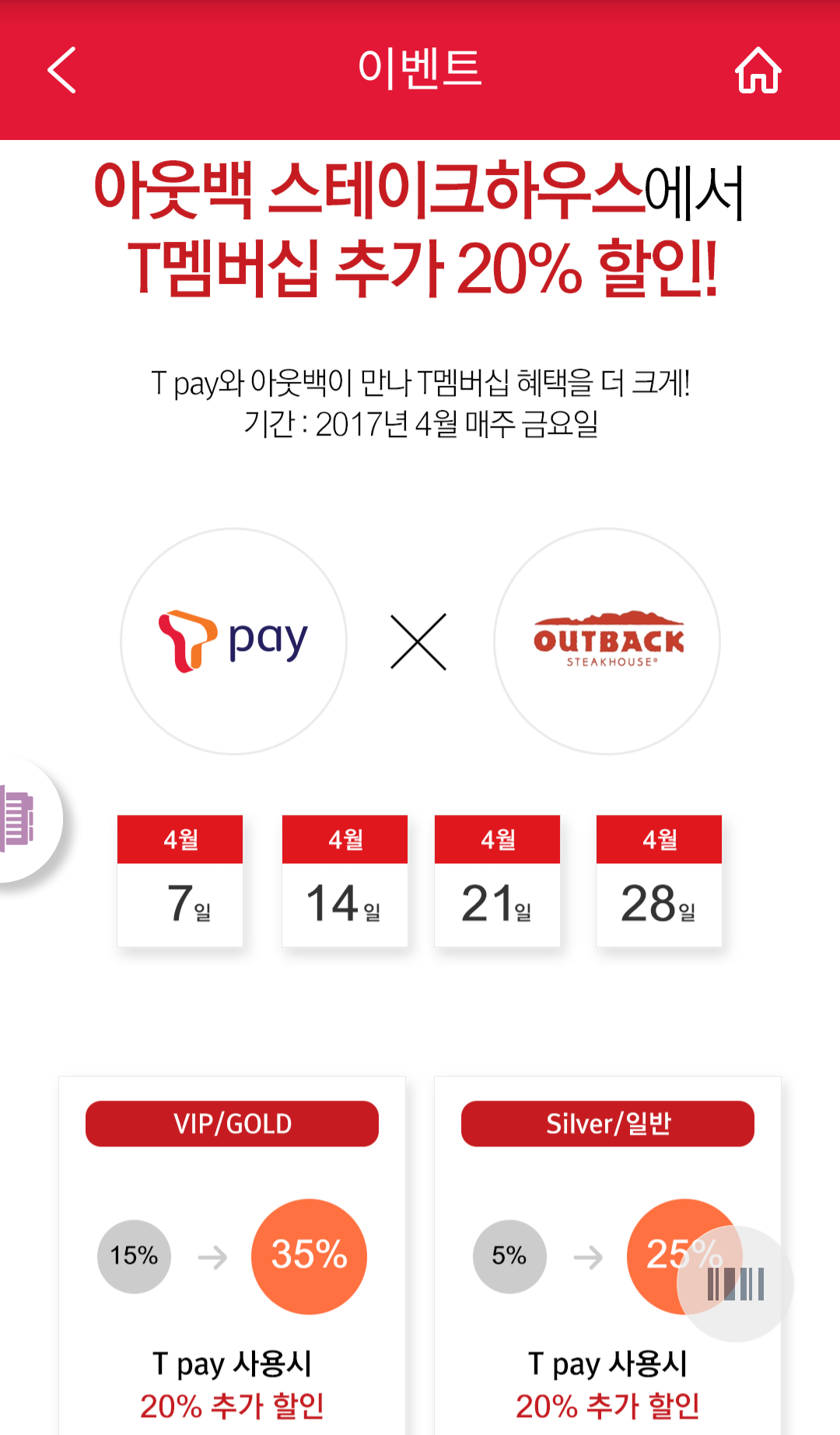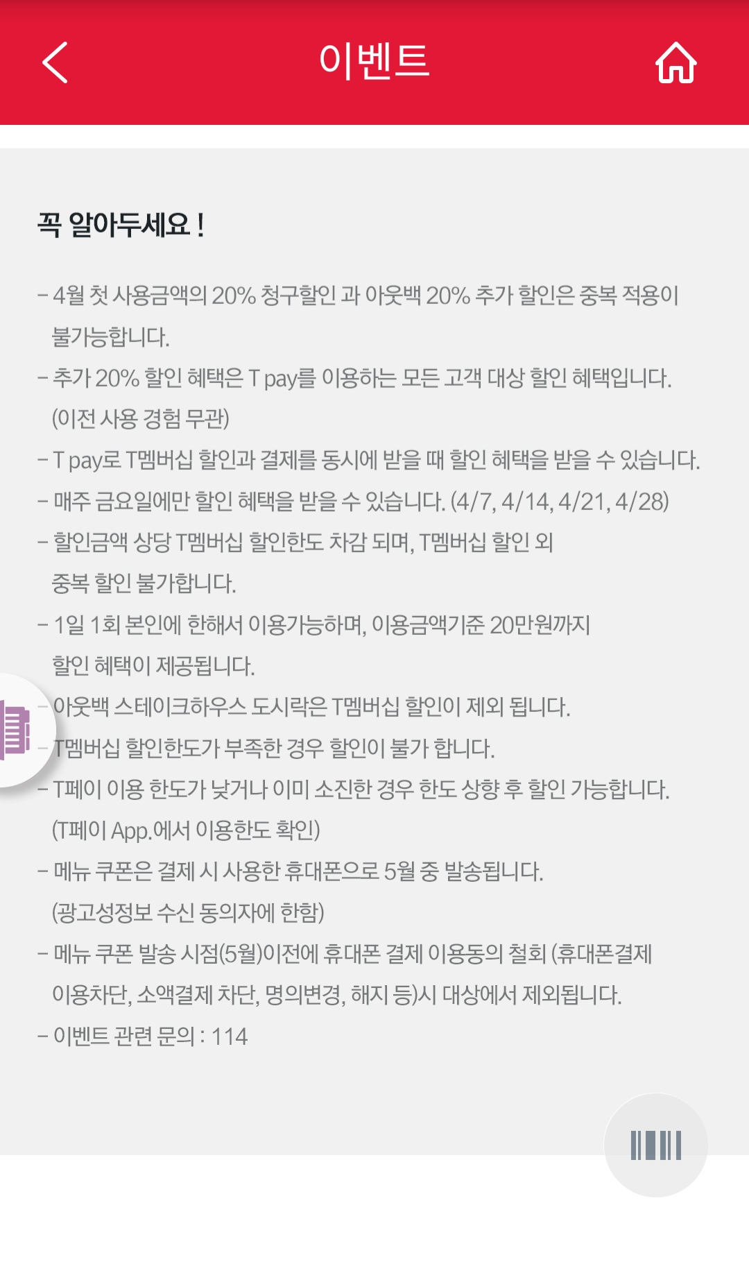 T페이 4월 첫구매 20%청구할인 중복도 안된다니 이름뿐인 이벤트인 것 같습니다.